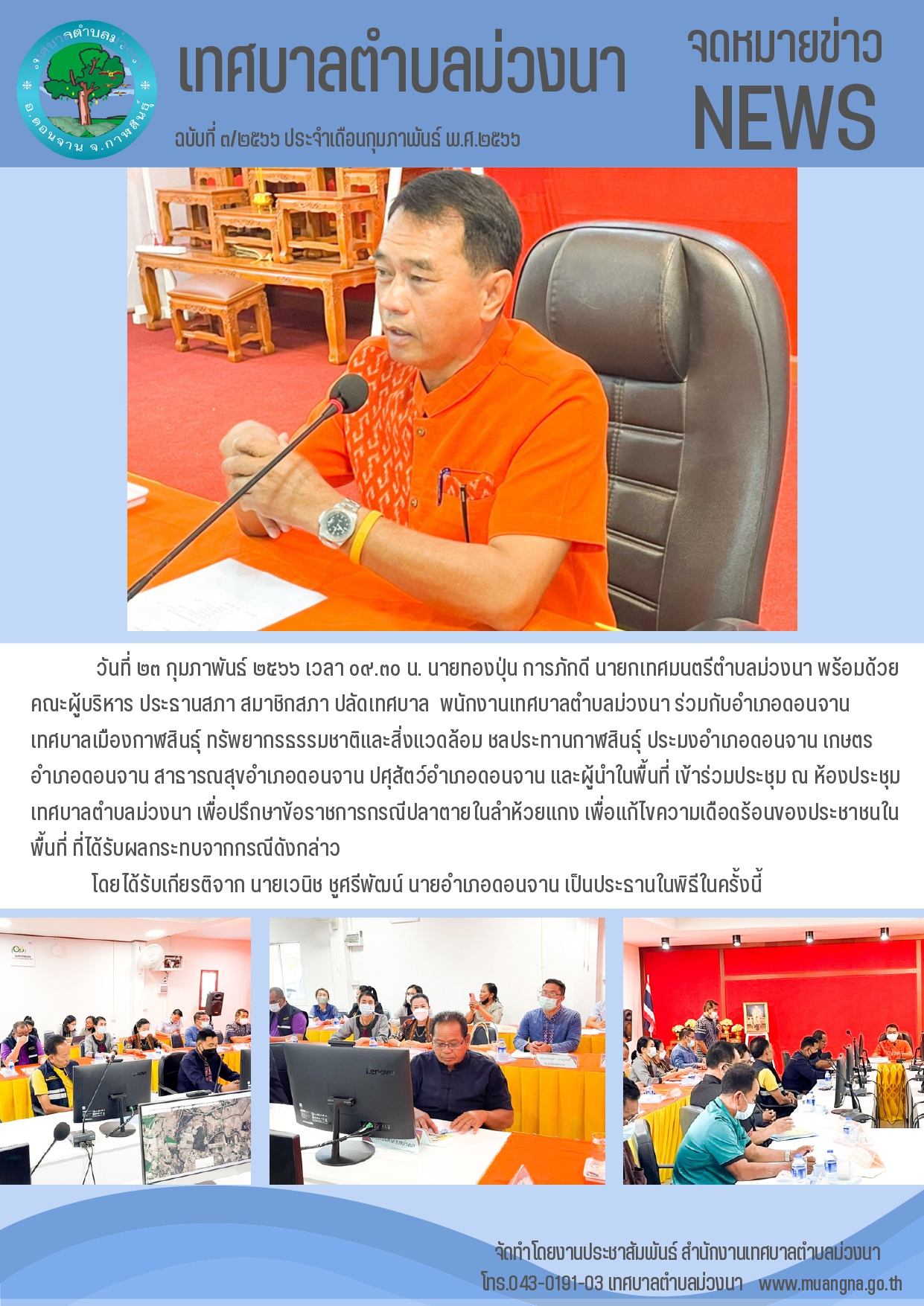 รายละเอียด : วันที่ ๒๓ กุมภาพันธ์ ๒๕๖๖ เวลา ๐๙.๓๐ น. นายทองปุ่น การภักดี นายกเทศมนตรีตำบลม่วงนา พร้อมด้วย คณะผู้บริหาร ประธานสภา สมาชิกสภา ปลัดเทศบาล พนักงานเทศบาลตำบลม่วงนา ร่วมกับอำเภอดอนจาน เทศบาลเมืองกาฬสินธฺุ์ ทรัพยากรธรรมชาติและสิ่งแวดล้อม ชลประทานกาฬสินธุ์ ประมงอำเภอดอนจาน เกษตรอำเภอดอนจาน สาธารณสุขอำเภอดอนจาน ปศุสัตว์อำเภอดอนจาน และผู้นำในพื้นที่ เข้าร่วมประชุม ณ ห้องประชุมเทศบาลตำบลม่วงนา เพื่อปรึกษาข้อราชการกรณีปลาตายในลำห้วยแกง เพื่อแก้ไขความเดือดร้อนของประชาชนในพื้นที่ ที่ได้รับผลกระทบจากกรณีดังกล่าว โดยได้รับเกียรติจาก นายเวนิช ชูศรีพัฒน์ นายอำเภอดอนจาน เป็นประธานในพิธีในครั้งนี้