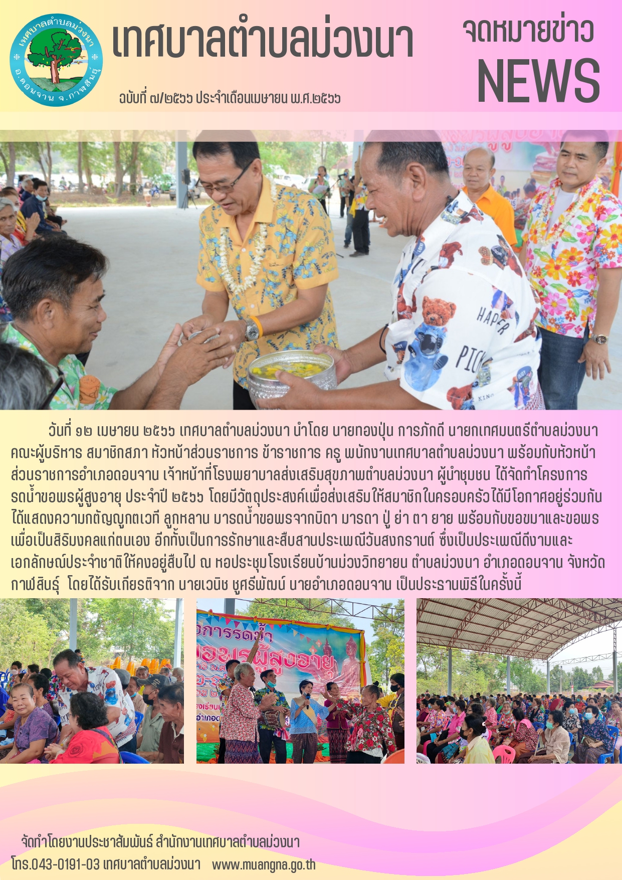รายละเอียด : วันที่ ๑๒ เมษายน ๒๕๖๖ เทศบาลตำบลม่วงนา นำโดย นายทองปุ่น การภักดี นายกเทศมนตรีตำบลม่วงนา คณะผู้บริหาร สมาชิกสภา หัวหน้าส่วนราชการ ข้าราชการ ครู พนักงานเทศบาลตำบลม่วงนา พร้อมกับหัวหน้าส่วนราชการอำเภอดอนจาน เจ้าหน้าที่โรงพยาบาลส่งเสริมสุขภาพตำบลม่วงนา ผู้นำชุมชน ได้จัดทำโครงการรดนํ้าขอพรผู้สูงอายุ ประจำปี ๒๕๖๖ โดยมีวัตถุประสงค์เพื่อส่งเสริมให้สมาชิกในครอบครัวได้มีโอกาศอยู่ร่วมกัน ได้แสดงความกตัญญูกตเวที ลูกหลาน มารดนํ้าขอพรจากบิดา มารดา ปู่ ย่า ตา ยาย พร้อมกับขอขมาและขอพรเพื่อเป็นสิริมงคลแก่ตนเอง อีกทั้งเป็นการรักษาและสืบสานประเพณีวันสงกรานต์ ซึ่งเป็นประเพณีดีงามและเอกลักษณ์ประจำชาติให้คงอยู่สืบไป ณ หอประชุมโรงเรียนบ้านม่วงวิทยายน ตำบลม่วงนา อำเภอดอนจาน จังหวัดกาฬสินธุ์ โดยได้รับเกียรติจาก นายเวนิช ชูศรีพัฒน์ นายอำเภอดอนจาน เป็นประธานพิธีในครั้งนี้