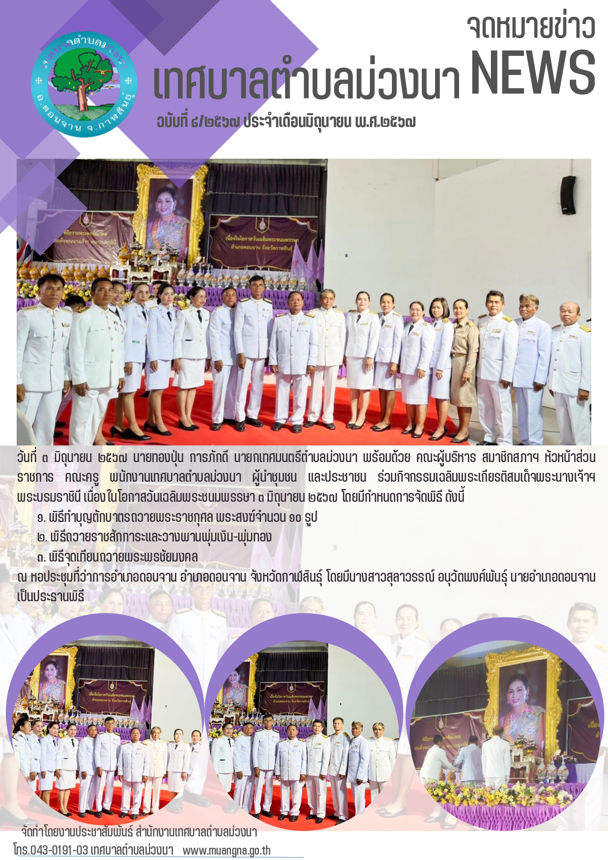 รายละเอียด : วันที่ ๓ มิถุนายน ๒๕๖๗ นายทองปุ่น การภักดี นายกเทศมนตรีตำบลม่วงนา พร้อมด้วย คณะผู้บริหาร สมาชิกสภาฯ หัวหน้าส่วนราชการ คณะครู พนักงานเทศบาลตำบลม่วงนา ผู้นำชุมชน และประชาชน ร่วมกิจกรรมเฉลิมพระเกียรติสมเด็จพระนางเจ้าฯ พระบรมราชินี เนื่องในโอกาสวันเฉลิมพระชนมพรรษา ๓ มิถุนายน ๒๕๖๗ โดยมีกำหนดการจัดพิธี ดังนี้