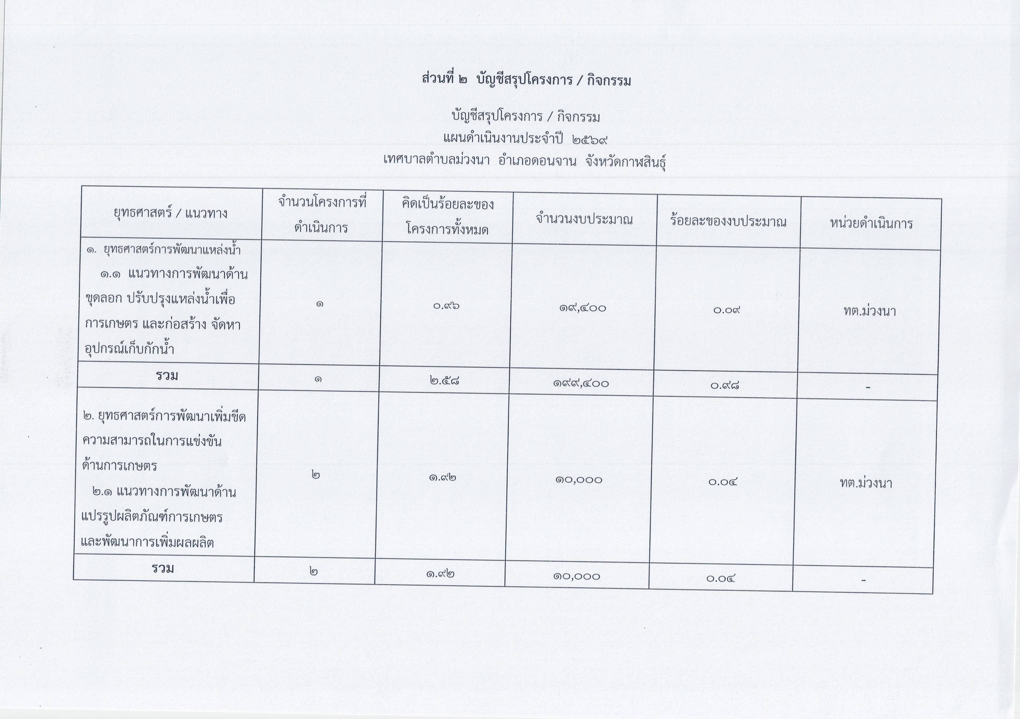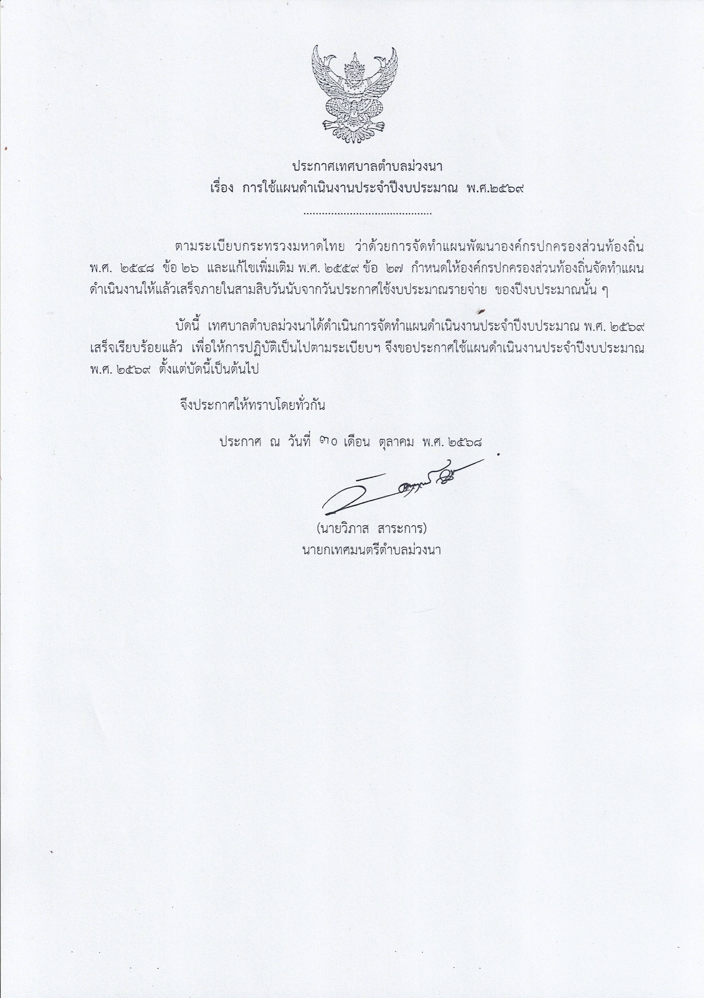 ชื่อเรื่อง : ประกาศเทศบาลตำบลม่วงนา เรื่อง การใช้แผนดำเนินงานประจำปีงบประมาณ พ.ศ. 2569